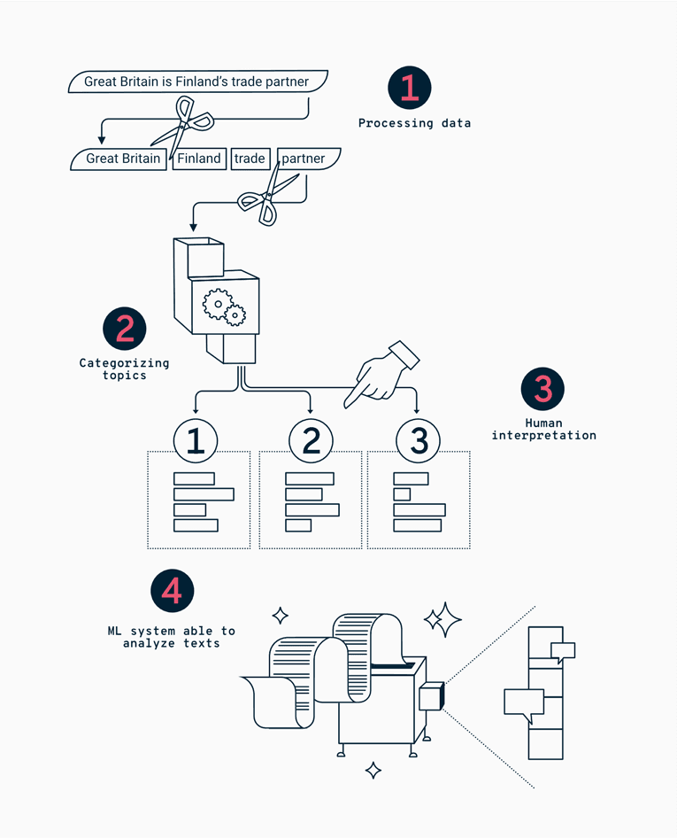 The Finnish Prime Minister's Office (Valtioneuvoston kanslia, VNK) commissioned a text analysis project from Emblica to educate them about the utilization of machine learning technologies. For this purpose, the Finnish government programs were analysed with ML methods to identify topics and contexts across the whole text material.