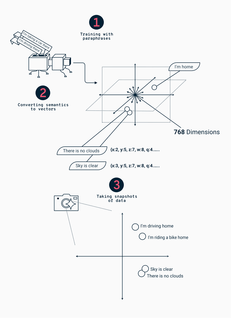 In order to train another model for detecting the contexts from government programs, a contextual model was trained by using sentences with similar semantic meanings (paraphrases). These semantics are then transferred into dimensions, which form the contextual space for the sentences. Similar sentences are close to each other in the space. Because the material included many dimensions (768 to be exact), the dimensions were reduced to 2-3 for visualisation and analysis purposes. This gave us the possibility to take snapshots and compare the similarities and the differences between contexts of the sentences.