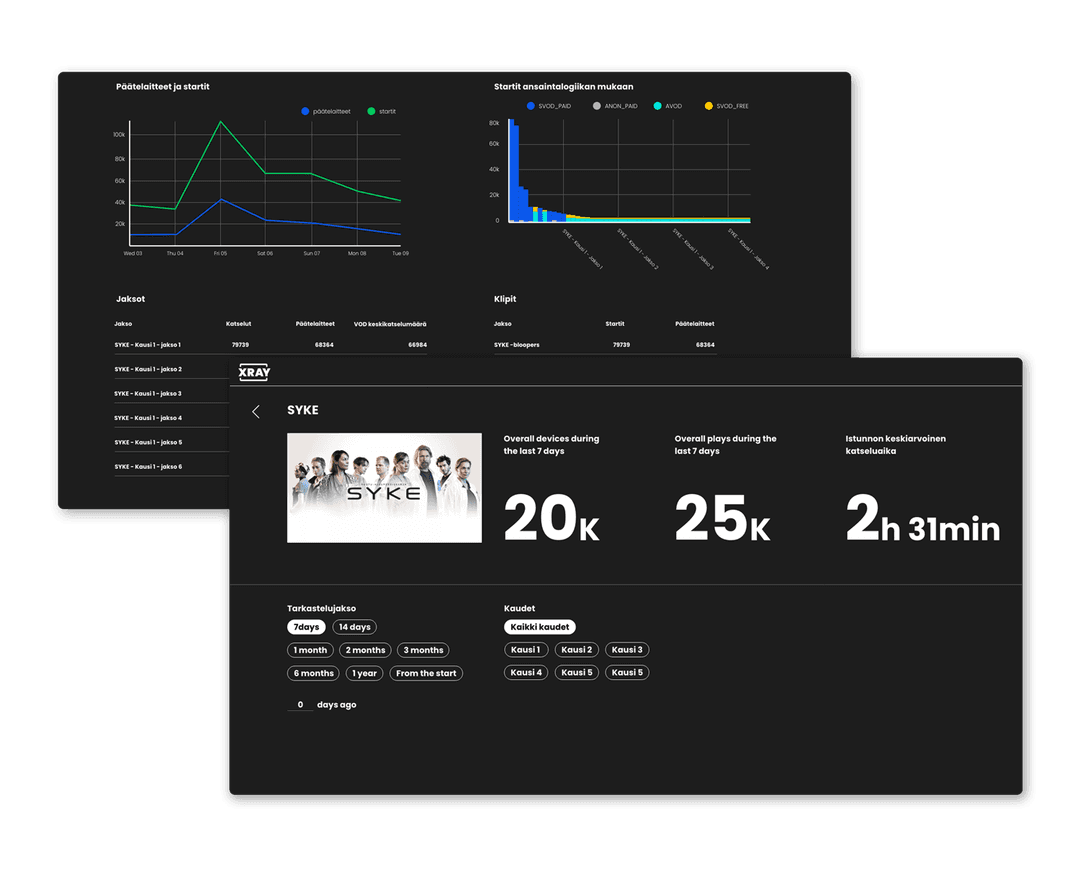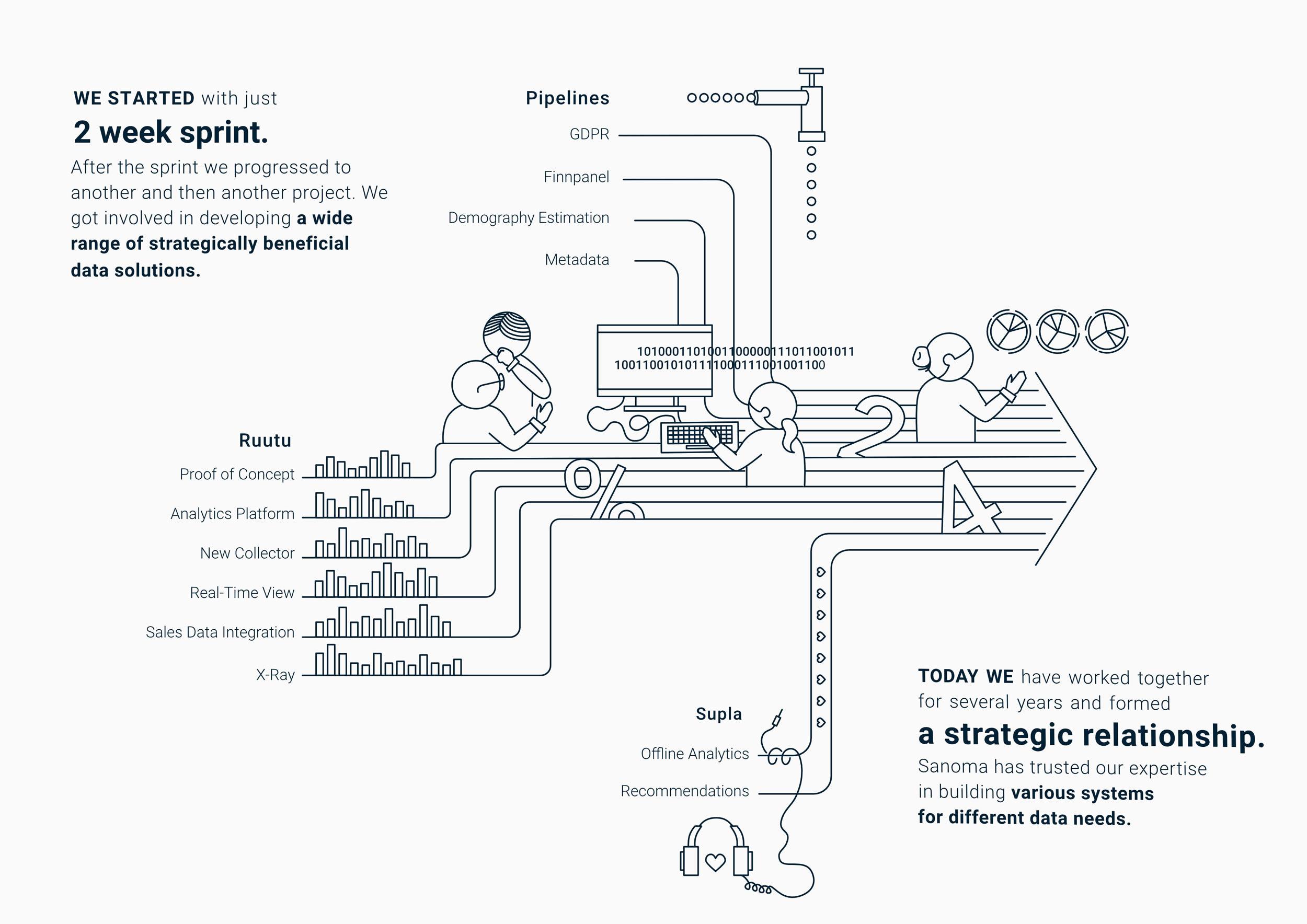 Collaboration with Sanoma and Emblica started when Nelonen was contemplating the next tool to fullfil the analytics needs their online video platform had. The first Proof Of Concept for analytics was built in two weeks, using an existing clickstream data source on top of AWS. The successful trial was followed by almost a year-long pilot, to build the foundations for an entirely new way to process, visualize, and understand analytics and customers in Sanoma.