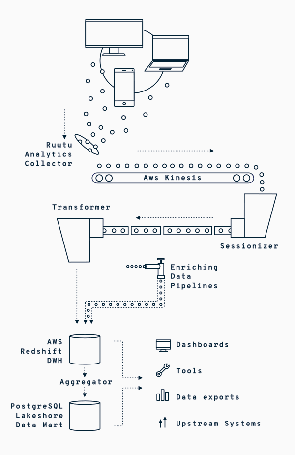 After the data, the most precious piece of Sanoma’s analytics system is its architecture. Instead of a gigantic monolith, the implemented micro-service architecture distributes all parts of the system as separate, well-defined pieces of the pipeline. There are different modules for taking in raw events, and aggregating them as sessions. Another component processes a chunk of events, and produces a single session with metrics. This way of structuring makes development and deployment easier, as we can focus on a certain component without a fear of breaking the whole pipeline. On top of that, multiple pipelines can be run simultaneously using the same source data. And of course, these results can be compared.