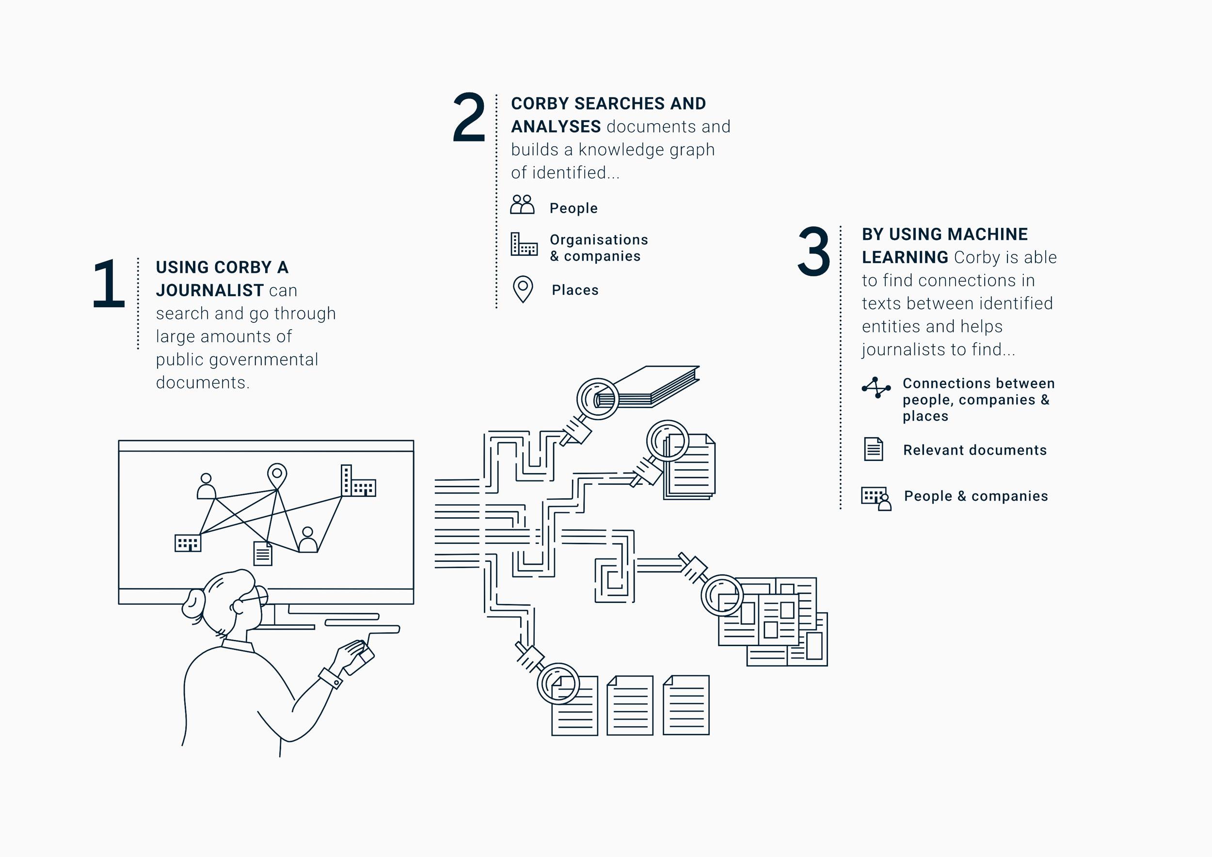 Our solution shaped to become an intelligent search engine called Corby. The system scans public organizations for their documents and finds the correct contents for the journalist, all with one search. This means that Corby does not only find the correct documents, but is able to detect people, places and companies that are mentioned. Thanks to this, Corby can form networks of all the entities who are mentioned in the public files, which allows the journalist to work more efficiently when looking for connections between people and/or organizations.