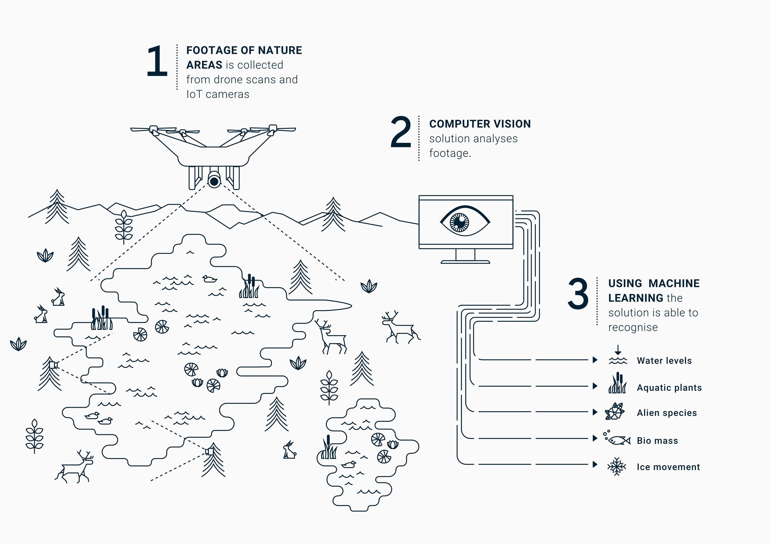 We built several neural models to recognize the different areas of interest from images. The images were taken by trail cameras monitoring the water levels, or by drones which performed fly-bys over Finnish wilderness, looking for alien species among other things. The models were trained with various schemes, some of which were hand-annotated from fly-by imagery to deliver state-of-the-art recognition (aquatic plants and alien species), or by automatically generated datasets (water levels). These models generate masks over images which denote what exact pixels belong to the detected object. With this it is easy to calculate the area of water plants, for example, which gives the biomass estimation directly. After this, the data is sent to servers for recognition tasks, either automatically from trail cameras or manually from drone flights. With these classifications we can then construe reports for the experts to interpret.
